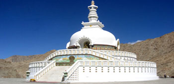 | The striking Shanti Stupa is a recent structure. This Stupa was been constructed in 1985 by a Japanese who harboured the ambition of spreading Buddhism across the world with aid from the Japanese Government. The stupa is connected by a 'motorable' road and a steep flight of stairs. Once on top, you can stop for a snack in the tea shop, then relax and enjoy the panoramic view of the chain of mountains and the peaceful little village of Changspa with typical Ladakhi houses built along a gushing stream, and the towering Namgyal Tsemo in the distance.